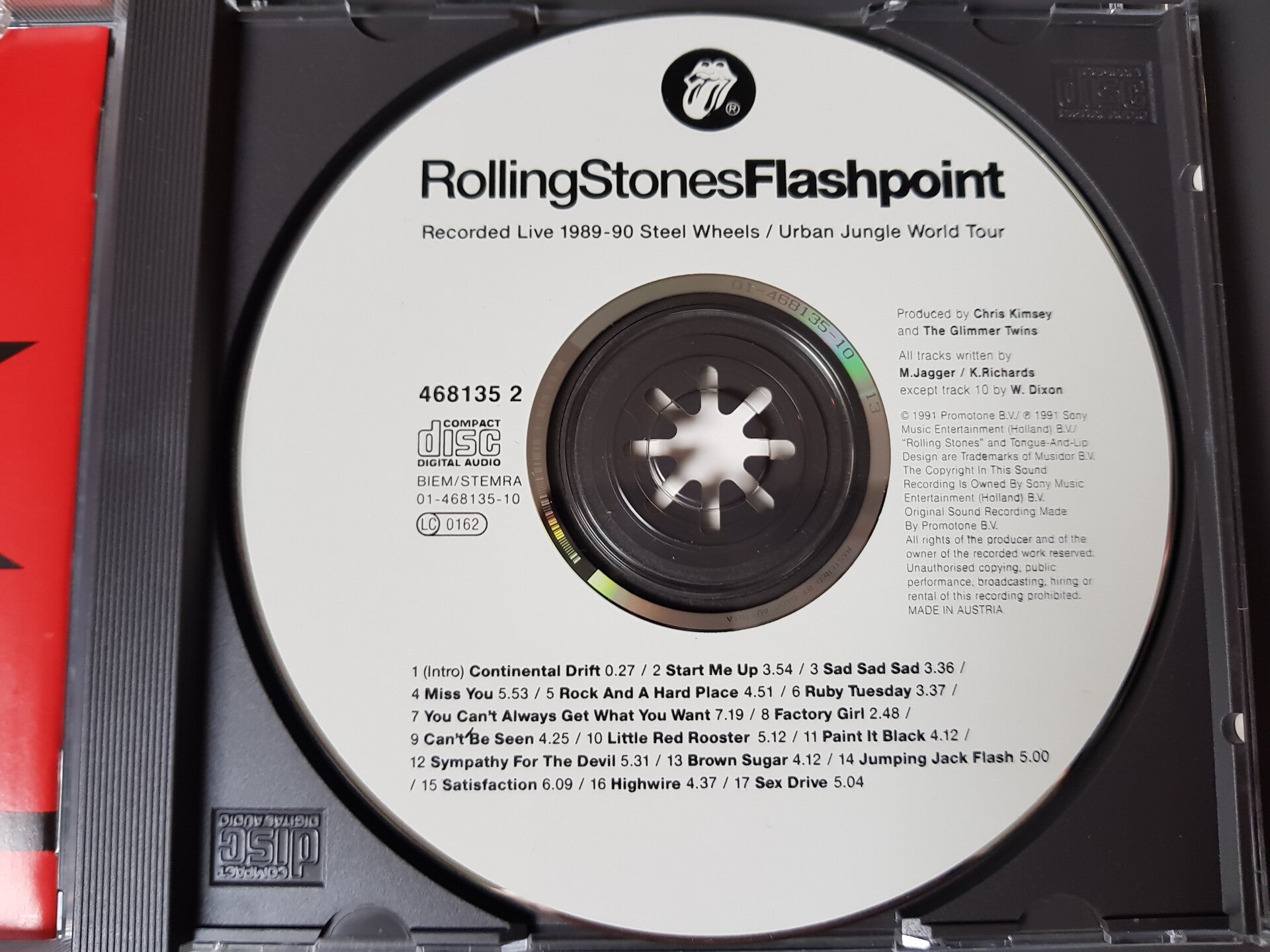 Made in Austria 1989 in the "Nice Price" serie. This issue was done in a red tray. Besides that this issue was released for the German market. On the front is a small Steel Wheels logo sticker says : One time only, the tounge. So this one came with the round Steel Wheels logo sticker.