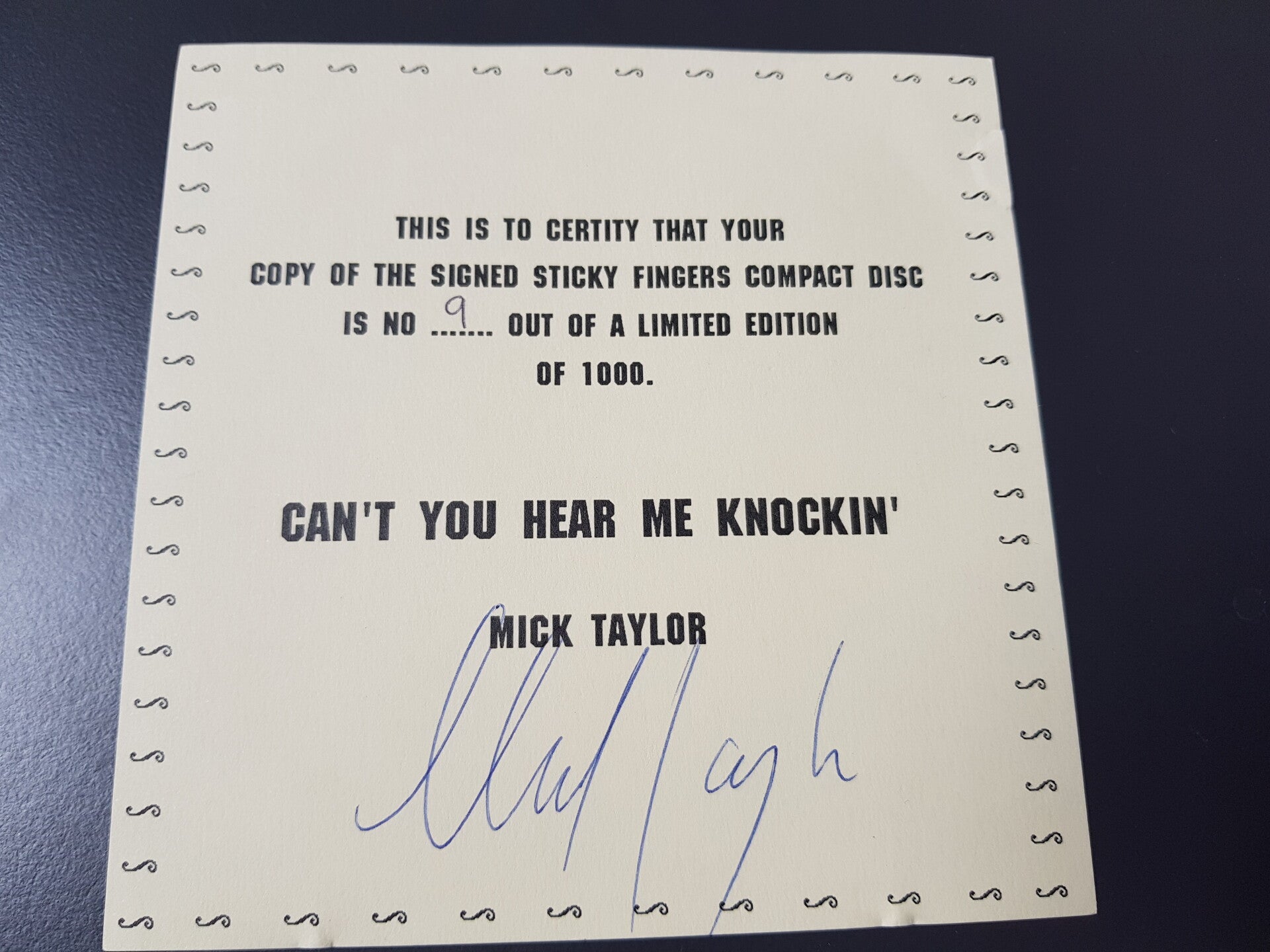 This release contain a sheet whick is numbered (no 9 ) andit is signed by Mick Taylor. The whole issue comes in a bag with the Sticky Fingers cover and a real zipper.