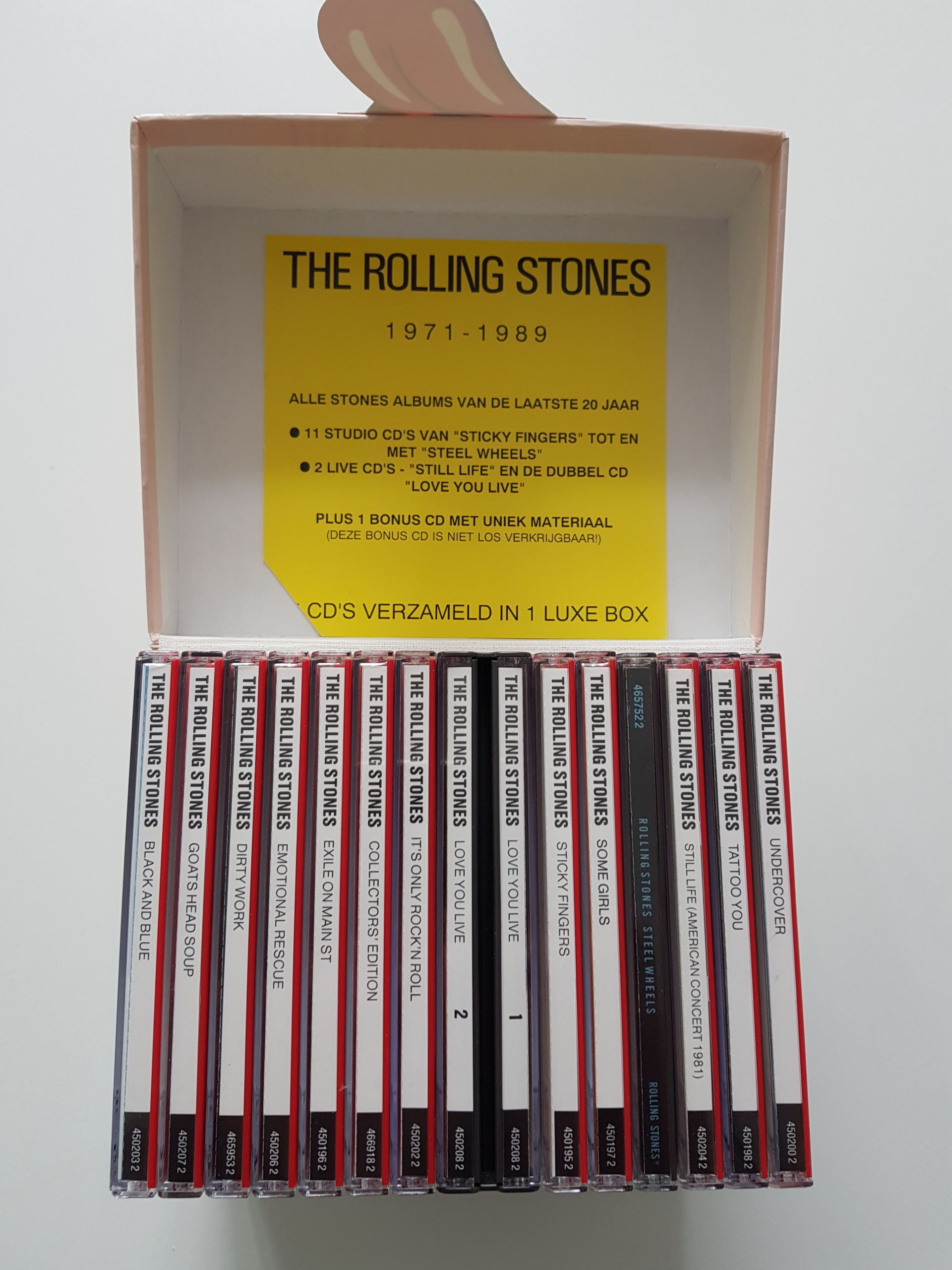 14 albums in a nice box with the famous red tounge on the front. This box has a Dutch info sheet. Some boxes might have a numbered sticker on it. Ordernr. box:CBS RECORDS 466918 2 CDX 01-466918-10